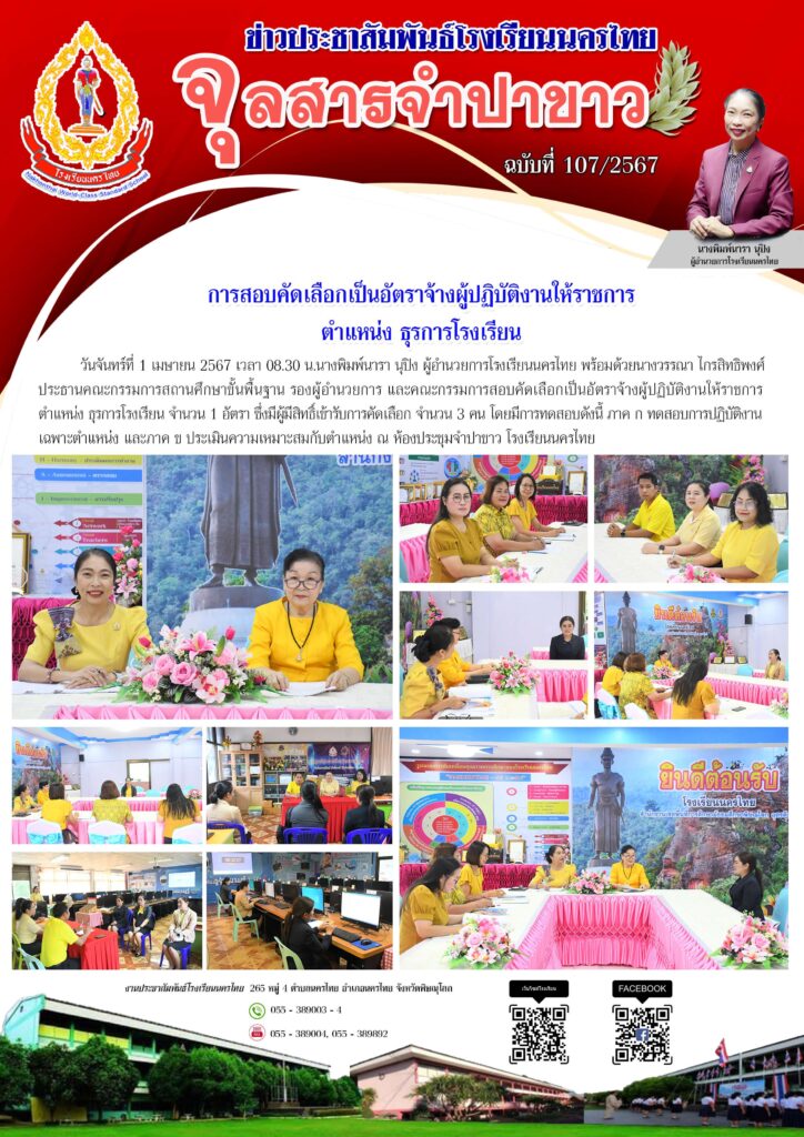 รองผู้อำนวยการ และคณะกรรมการสอบคัดเลือกเป็นอัตราจ้างผู้ปฏิบัติงานให้ราชการ ตำแหน่ง ธุรการโรงเรียน จำนวน 1 อัตรา ซึ่งมีผู้มีสิทธิ์เข้ารับการคัดเลือก จำนวน 3 คน โดยมีการทดสอบดังนี้ ภาค ก ทดสอบการปฏิบัติงานเฉพาะตำแหน่ง และภาค ข ประเมินความเหมาะสมกับตำแหน่ง ณ ห้องประชุมจำปาขาว โรงเรียนนครไทย