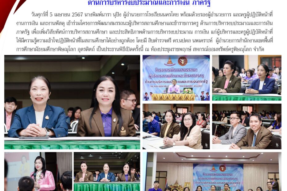เข้าร่วมโครงการพัฒนาสมรรถนะผู้บริหารสถาศึกษาและข้าราชการครู ด้านการบริหารงบประมาณและการเงิน ภาครัฐ เพื่อเพิ่มวิสัยทัศน์การบริหารสถาศึกษา และประสิทธิภาพด้านการบริหารงบประมาณ การเงิน แก่ผู้บริหารและครูผู้ปฏิบัติหน้าที่ให้มีความรู้ความเข้าใจปฏิบัติหน้าที่ในสถานศึกษาได้อย่างถูกต้อง โดยมี สิบตำรวจตรี ดร.นปดล นพเคราะห์ ผู้อำนวยการสำนักงานเขตพื้นที่การศึกษามัธยมศึกษาพิษณุโลก อุตรดิตถ์ เป็นประธานพิธีปิดครั้งนี้ ณ ห้องประชุมราชพฤกษ์ สหกรณ์ออมทรัพย์ครูพิษณุโลก จำกัด