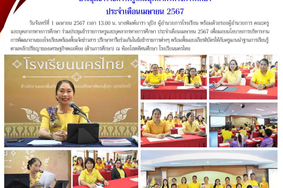 วันจันทร์ที่ 1 เมษายน 2567 เวลา 13.00 น. นางพิมพ์นารา นุปิง ผู้อำนวยการโรงเรียน พร้อมด้วยรองผู้อำนวยการ คณะครูและบุคลากรทางการศึกษา ร่วมประชุมข้าราชการครูและบุคลากรทางการศึกษา ประจำเดือนเมษายน 2567