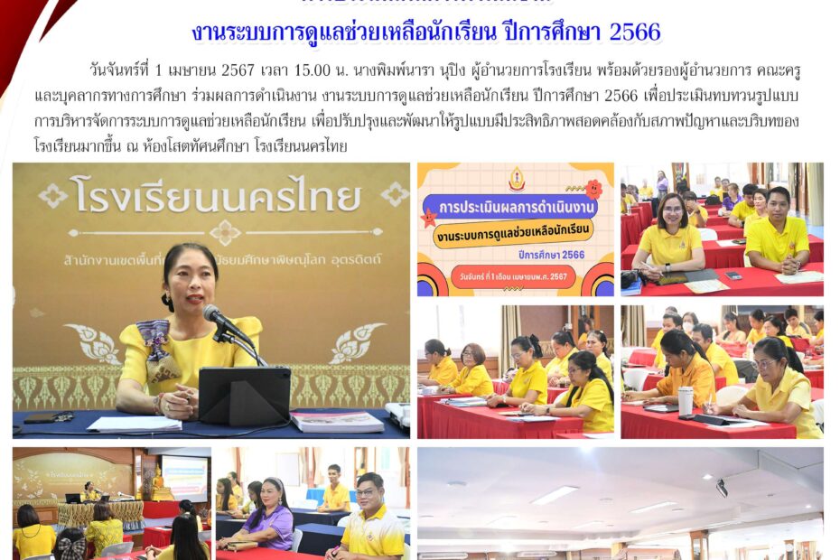 วันจันทร์ที่ 1 เมษายน 2567 เวลา 15.00 น. นางพิมพ์นารา นุปิง ผู้อำนวยการโรงเรียน พร้อมด้วยรองผู้อำนวยการ คณะครูและบุคลากรทางการศึกษา ร่วมผลการดำเนินงาน งานระบบการดูแลช่วยเหลือนักเรียน ปีการศึกษา 2566