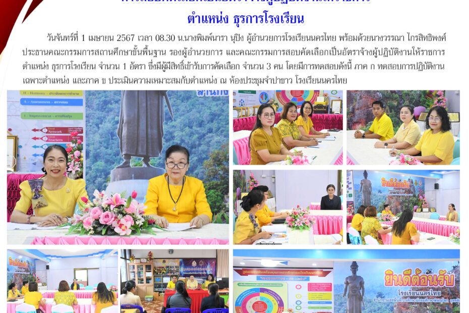 วันจันทร์ที่ 1 เมษายน 2567 เวลา 08.30 น.นางพิมพ์นารา นุปิง ผู้อำนวยการโรงเรียนนครไทย พร้อมด้วยนางวรรณา ไกรสิทธิพงศ์ ประธานคณะกรรมการสถานศึกษาขั้นพื้นฐาน