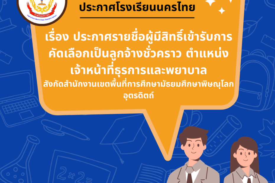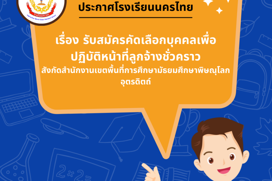 ประกาศโรงเรียนนครไทย เรื่อง บัญชีรายชื่อผู้ผ่านการคัดเลือกบุคคลเพื่อเป็นลูกจ้างชั่วคราว ตำแหน่ง เจ้าหน้าที่ทะเบียนและวัดผลby admin26/12/202526/12/2025ตามประกาศโรงเรียนนครไทย ล… Read More »ประกาศโรงเรียนนครไทย เรื่อง บัญชีรายชื่อผู้ผ่านการคัดเลือกบุคคลเพื่อเป็นลูกจ้างชั่วคราว ตำแหน่ง เจ้าหน้าที่ทะเบียนและวัดผล